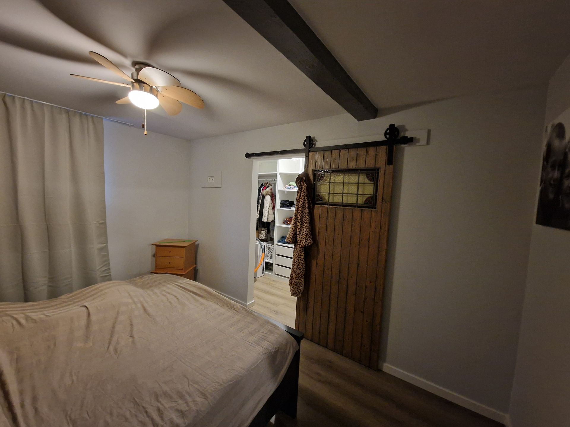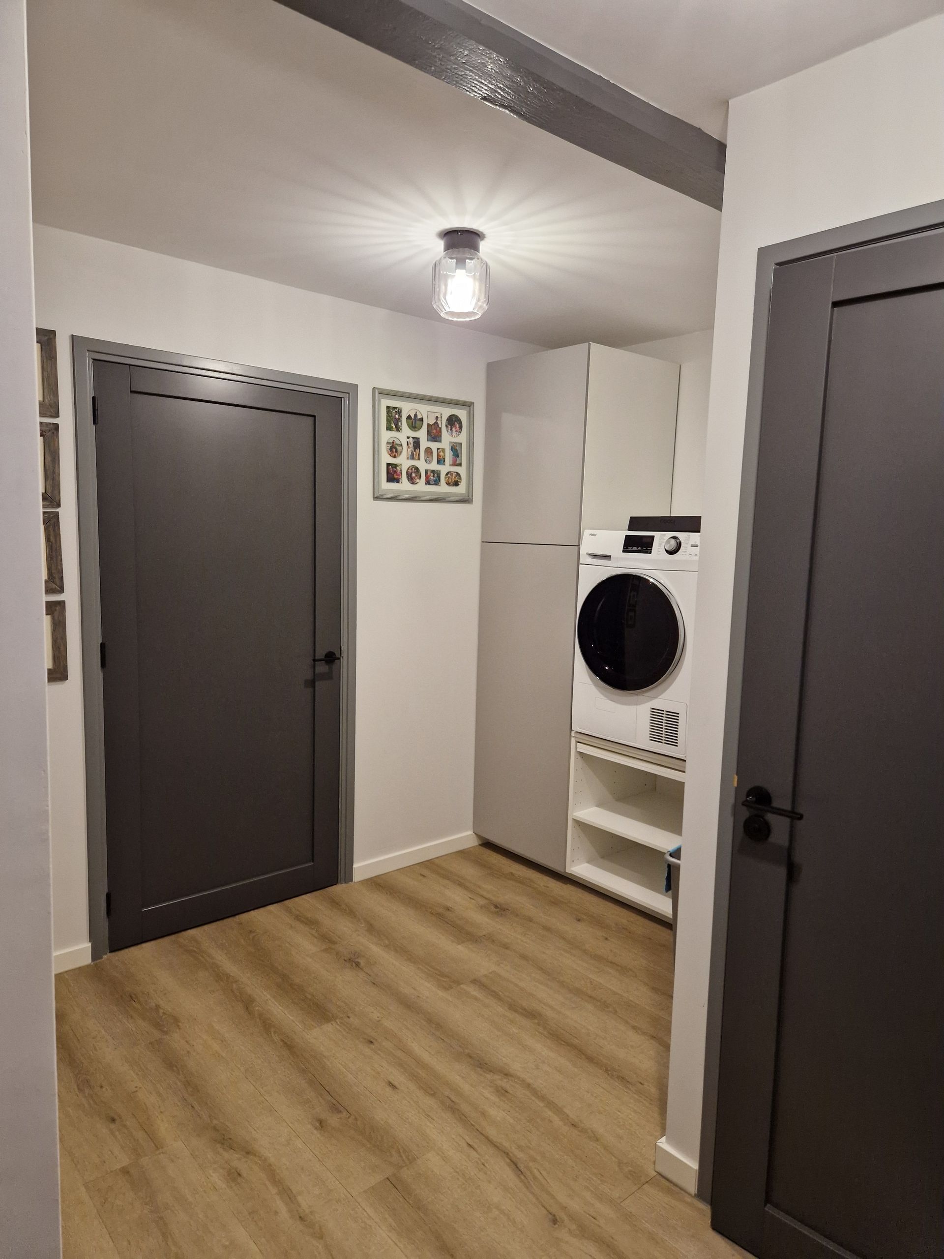 Er is hier voor gekozen om de huidige ingang te verplaatsen om deze in lijn te brengen met de hal. Op deze manier is er een nieuw gedeelte gecreëerd waarbij de slaapkamer grenst aan een bijkeuken met wasfaciliteiten, toilet en badkamer.
